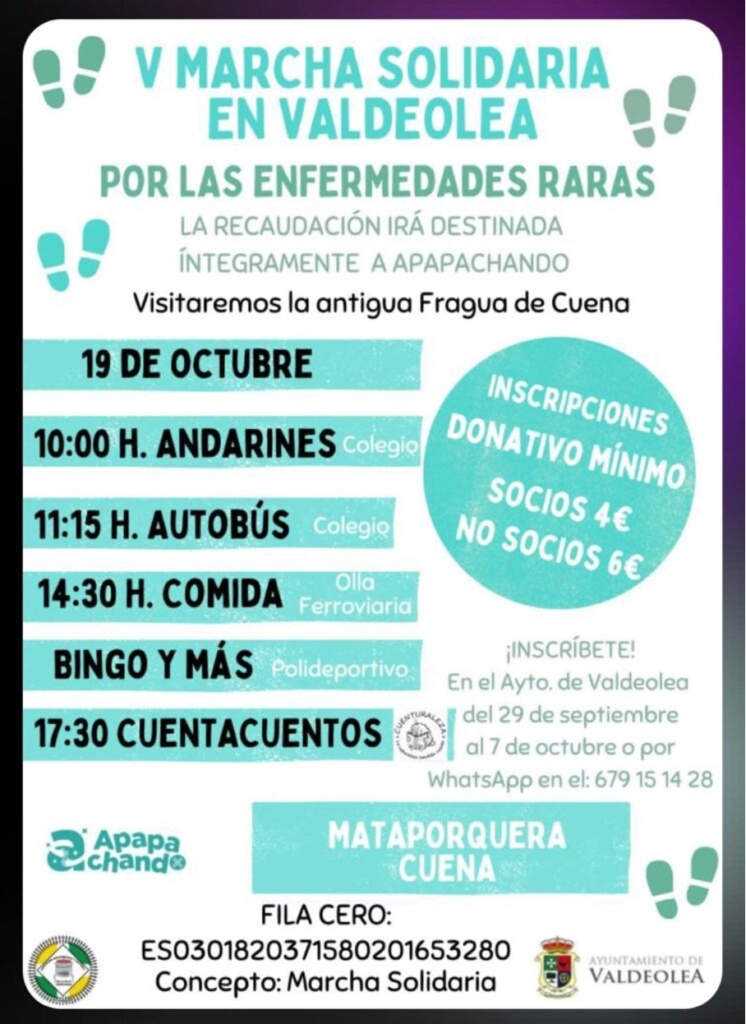 El domingo 19 de octubre tendrá lugar la V Marcha Solidaria en Valdeolea, organizada en beneficio de las enfermedades raras. La recaudación íntegra irá destinada a Apapachando, asociación dedicada al acompañamiento, apoyo y visibilización de personas y familias que conviven con estas dolencias.